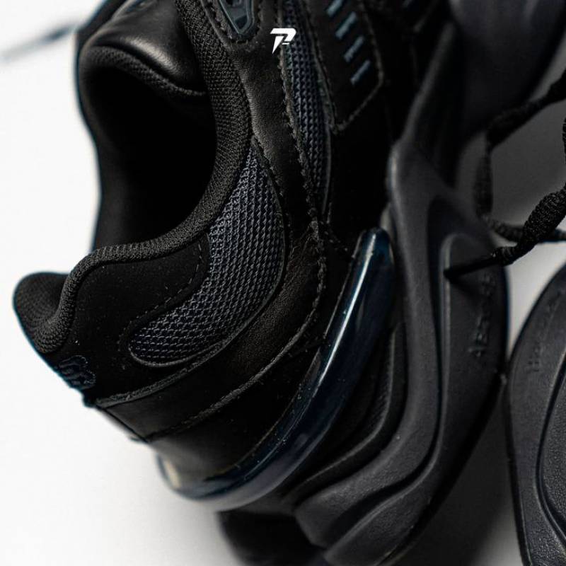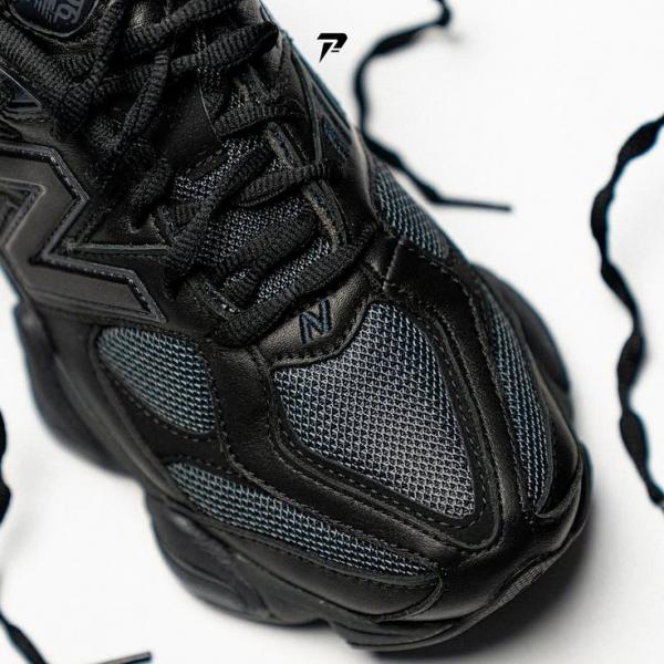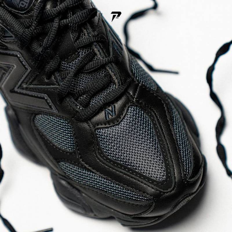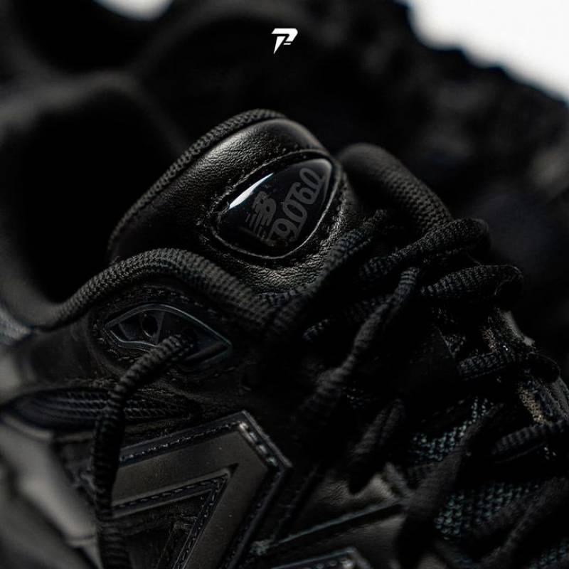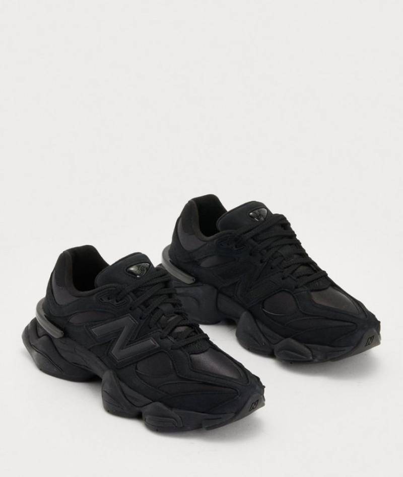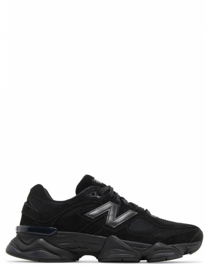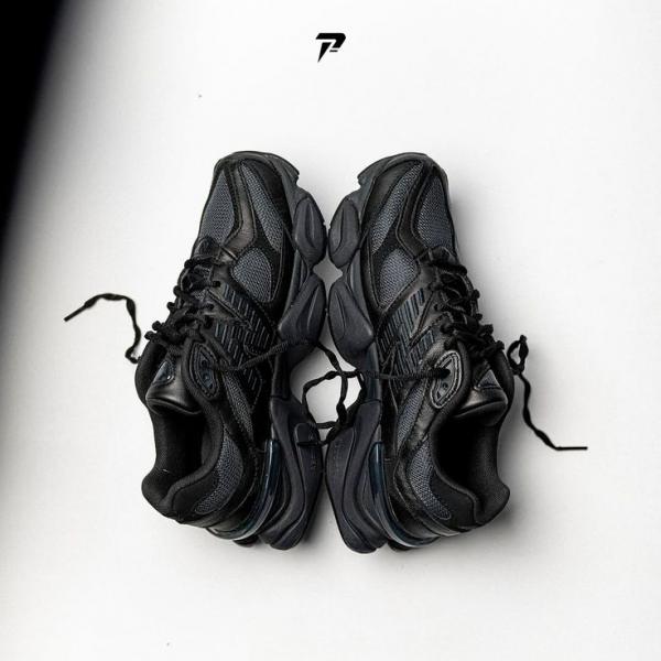 The New Balance 9060 'Triple Black Suede' borrows elements from New Balance's venerable 99X series, with the upper featuring black mesh construction with tonal wavy overlays in suede and synthetic leather. A jeweled NB 9060 badge embellishes the tongue, while a raised 'N' logo graces the lateral quarter panel. A stacked ABZORB midsole maintains the monochrome design